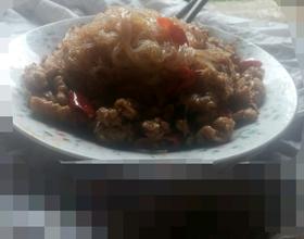 瘦肉炒好后,放入适量的水,烧开,倒入粉丝,大火煮,直至水快干是,大火快速翻炒收汁
