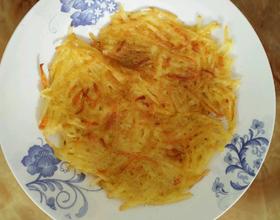 锅里放适量的油,烧热,小火,然后放入一些土豆丝,用铲子压一压,成一个饼状即可。不要都倒下去了,饼也不要做太厚,那样不好熟