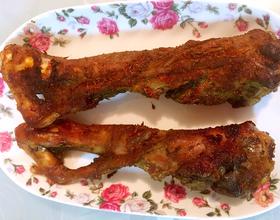 羊小腿改刀,切口,涂抹盐,十三香,海鲜酱油,孜然粉!冷藏5小时,入味
