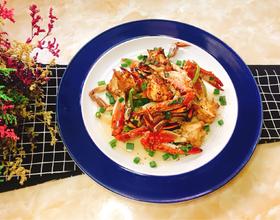 梭子蟹爆炒至外壳变红再加调料,葱白段快出锅前加入翻炒至出香味