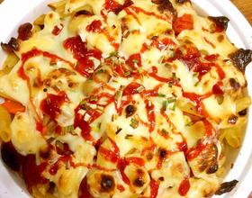 铺上提拉米苏碎,淋上番茄酱,撒上葱花~放入200度预热的烤箱~