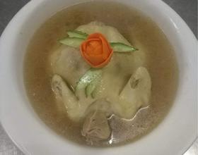 去头去鸡爪,脊梁骨拍断,留头一起放入高压锅,下料水调味,压8-10分钟,沥水