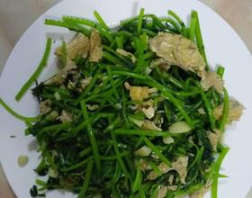 中火加入搅拌好的鸡蛋液,不要使劲搅拌,不然鸡蛋太碎不好夹,待鸡蛋八分熟加入茼蒿。