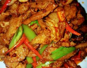 翻炒匀下入辣椒,蒜苗炒熟出锅。