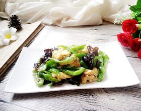 准备食材:青椒取掉籽斜刀条,葱切小段,黑木耳提前用水泡好洗净,忘拍了