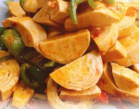 放入素鸡翻炒片刻后倒入半碗清水,稍煮片刻让豆瓣酱的味道融入到素鸡中。收汁前倒入青椒和盐翻炒均匀即可出锅。