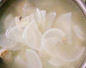 等到汤煮开了,把白萝卜片和白蘑菇片放入,然后放入适量的盐和鸡精(味精)。再煮个十分钟就可以啦。