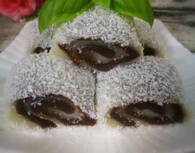 桌上铺块硅油纸撒上椰蓉把放凉后的糯米面擀成长方形,红豆沙也擀成和糯米面同等大小