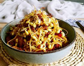 - 16. 放入酱油和盐调味,炒至豆芽断生即可出锅