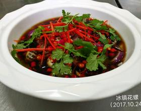 - 4. 锅烧少量水烧开,放入蒸鱼豉油、少量耗油、糖、味精、盐调味,将调好的汁倒入装有小尖椒的碗拌匀,随后浇在花螺上,面上放冰块撒香菜节红椒丝即可。另找一个小碟子倒入芥末加点花螺里的汤汁拌匀,用用花螺沾着吃。