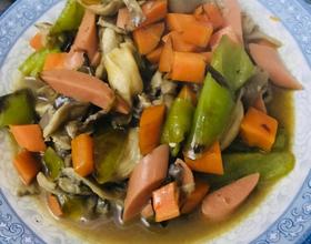 先后加入火腿肠和蘑菇,并把准备好的油和蚝油放入