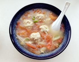- 6. 番茄切成滚刀块,用少量油先翻炒一下,然后加入水烧开后放入绿豆芽,并用勺子成型丸子后放入汤中,调小火烧开后即可。