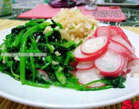 菠菜焯水后过凉水,加蒜末,盐,鸡精,香油,熟芝麻,少许醋拌匀;梨丝加白糖,香油少许,醋少许,香葱末拌匀;腌过的萝卜片挤去汤汁,加香葱拌匀;最后就是把这些分别拌好的东东放在一个大盘子里就好啦。