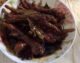 把料放入锅里,然后把鸡爪放入锅里,接着放水,大火开后小火慢炖1小时,最后收汁出锅