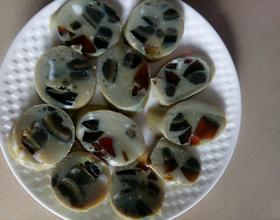 鸡蛋打入盆中,加入切碎的松花蛋,盐,面碱,花椒粉,搅匀