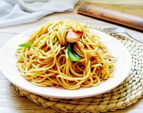 火腿肠切片,葱切花,油菜洗净,茎切丝