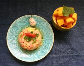 先炒熟料,加入米饭进行翻炒,加盐葱花调味