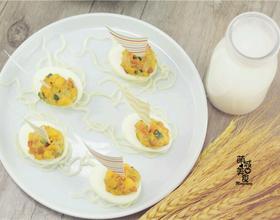 - 6. 4、鸡蛋切开,挖出蛋黄分别备用。