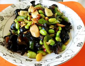 锅热放油,把葱片,姜,青椒,火腿放入煸出香味
