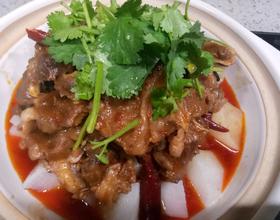 - 2. 白萝卜滚刀切块,汆盐水至九成熟入上菜钵中垫底。