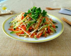 把胡萝卜丝,黄瓜丝,金针菇放在盆里