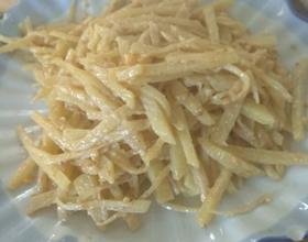 锅烧油,油6,7成热放蛋黄炒均匀,放入淖水的土豆丝快速翻炒均匀,放盐炒均,即可出锅