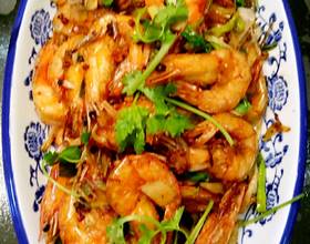 油热放入香蔴花椒,爆炒葱姜蒜,倒入调味料,再放炸大虾