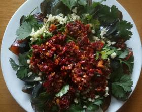 把切好的皮蛋装盘放上香菜和辣酱,然后在辣酱周围撒一圈切碎的大蒜子。