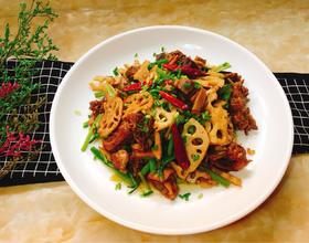 小火慢慢煎鸭肉,熬出鸭油,砂锅小火慢炖40分钟至鸭肉软熟,藕片吸收完鸭肉的汤汁再加芹菜炒