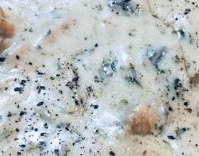 小汤锅加热倒入油,放入面粉或生粉,然后小火,放入酸奶,椰浆和沙拉酱,香菜碎调成糊状备用。
