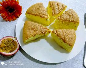 百香果对半切开,汁水连同果肉都倒进蛋黄中