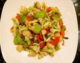 爆炒花菜,青辣椒,胡萝卜,蒜苗,葱姜丝翻炒匀,加入调味料,盐,出锅前放入醋,香油