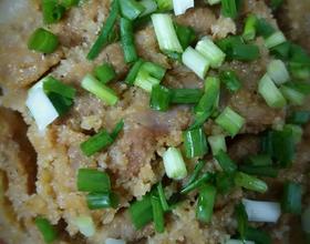 把蒸好的土豆粉蒸肉,取一个盘子扣在蒸肉碗上,双手两边按紧,再倒扣过来,撒上葱花即食。