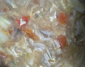 待水半开的时候放入粉丝,水开之后放入,白菜,百叶,最后是淀粉……然后两个鸡蛋打成散状……放入盐,白胡椒粉,烧开,起锅的时候放入少许香油,鲜菜适量……我今天没买到所以省略了。