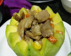 饭压上去,可以切掉里面一些南瓜,放饭里搅拌后压好