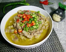 这道菜最关键的调料是海南的黄灯笼辣椒。因为有了它才能煮出金灿灿的汤汁。所需的蔬菜用开水焯烫,肥牛煮熟即可捞出。不吃太辣的,黄灯笼辣椒可以少放,最后双椒可以不放。出锅前放入少许的醋可去腥提鲜,还可使汤汁更加酸爽。