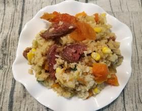 把 香菇 土豆 玉米 红萝卜 香肠切好放入大米上面 西红柿放中间