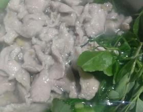 煮好的肉片汤倒入汤碗里 尽量让汤均匀地洒在每一根豌豆尖上。 如果像我图片中的那种。 吃的时候记着把没烫死的豌豆尖 汤再在汤里烫一会