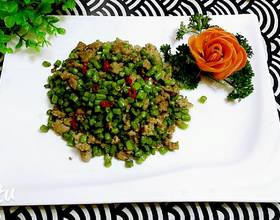 另起锅放油,倒入豆角炒,加适量的盐,再倒入肉未炒,加入杭椒丁翻炒均匀捞出即可。