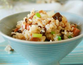 锅中倒入橄榄油, 烧热后先倒入洋葱炒至透明 ,再倒入火腿炒匀