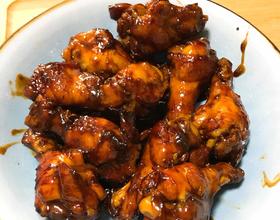 10分钟后,加入适量盐,开盖翻炒,收汁,一定要不断翻炒,汁液很浓,翻炒也可以给鸡翅上色