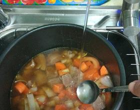 - 14. 将菜和牛肉放到高压锅中,加入调味汁。