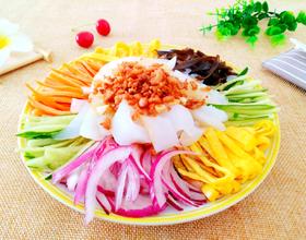 把胡萝卜,黄瓜丝,紫圆葱,鸡蛋皮,木耳