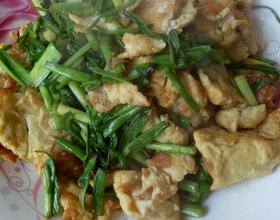 锅再入油,下蒜苗炒一会儿,加鸡蛋块,加点酱油,加点盐,炒匀即可。