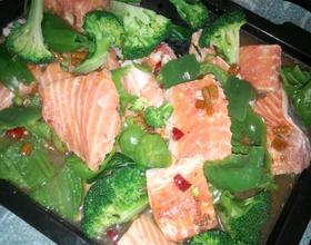 将食材装入烤盘,同时烤箱上下火210℃烤鱼档预热10分钟到