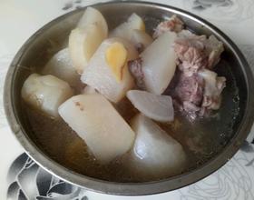 取容器放入筒骨萝卜还有生姜片,倒入适量的水,撒适量的盐份,用压力锅闷15-20分钟即可
