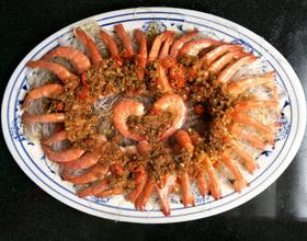 虾去头去虾线,粉丝放在温水中泡软。粉丝放在盘底,虾摆盘