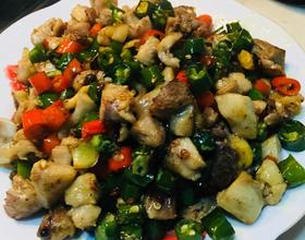 加入鸡丁翻炒,起锅时加少许糖、鸡精调味。