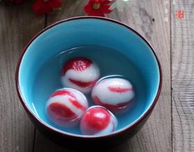 我们先来调红色汤圆、白色糯米粉中、加入一勺刚刚烧开的开水