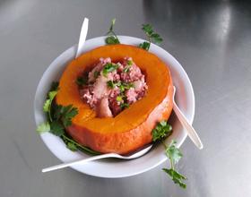 南瓜切成这样放碗里,再把里面的瓤掏空备用。